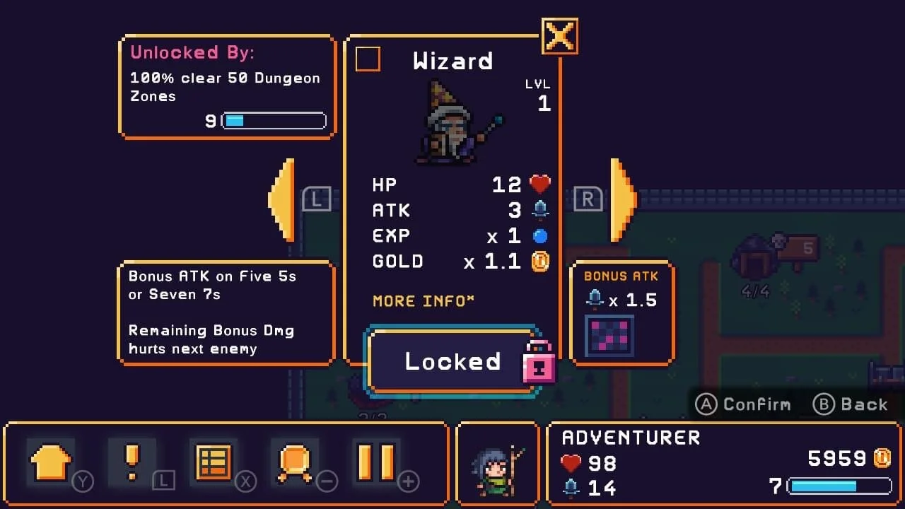 Visually, S.U.M. has a very basic pixel art style that works well with the simple gameplay. There’s a wide variety of monsters available for you to take on and each level loops through the different enemies. Characters are cute, with different appearances based on their classes. Sadly you can’t fully utilise these as best as I’d like, as they must be unlocked before use - and whilst you level up as you progress, this only affects the active character. So when you finally unlock a new one, you’ll be Level 1 with them, and have to start the grind all over again.