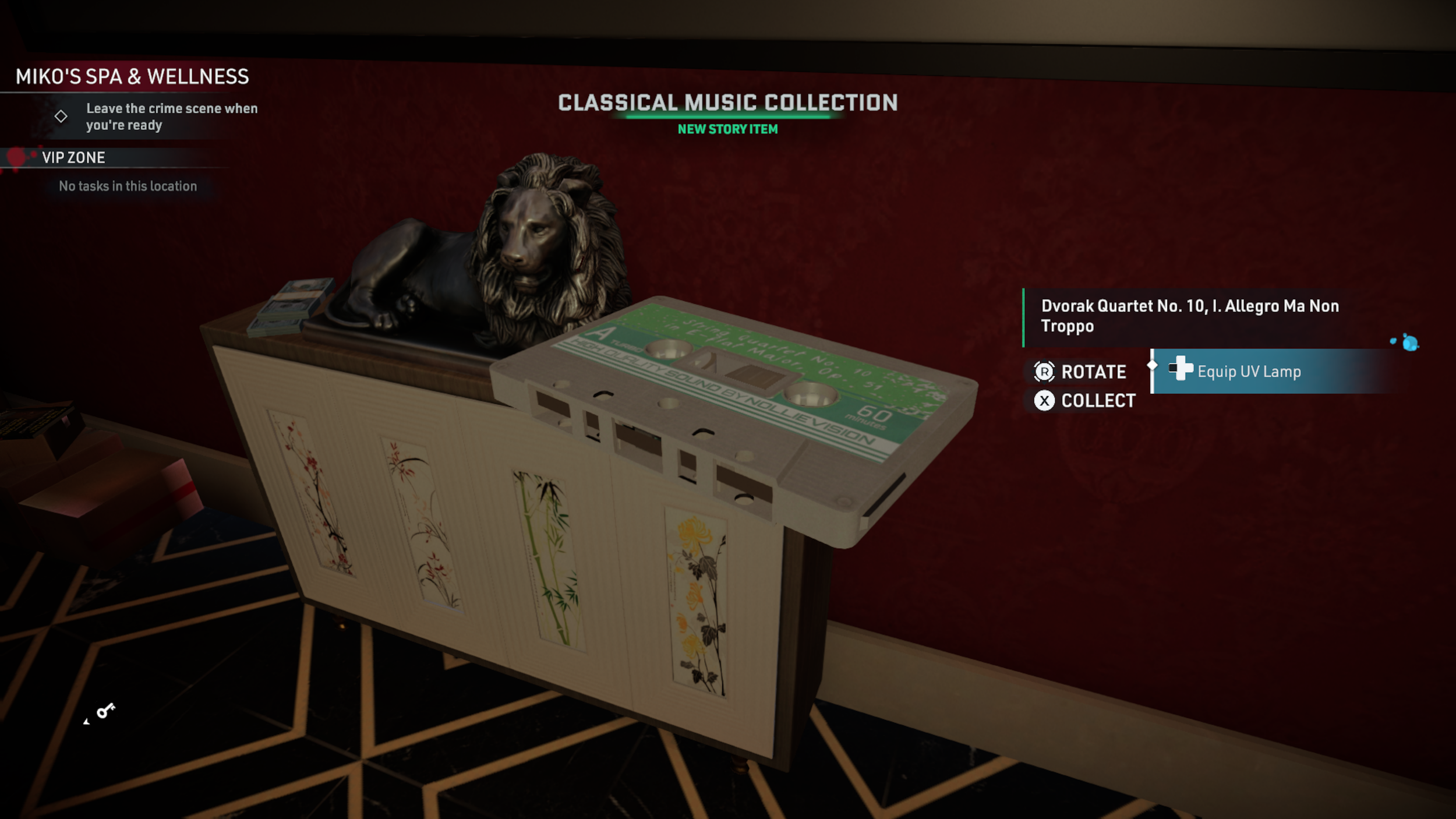 Tape 3: The Tape “Classical Music Collection: Dvorak Quartet No. 10, I. Allegro Ma Non Troppo” (titled Classical 2 in the Mission Complete screen) can be found in the VIP Room on the cabinet with the lion statue on it.